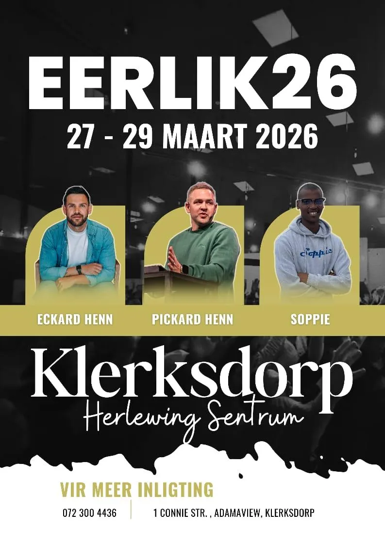EERLIK26 bring ons saam vir drie dae van Woord, aanbidding en ontmoeting — in eenvoud, waarheid en gehoorsaamheid.